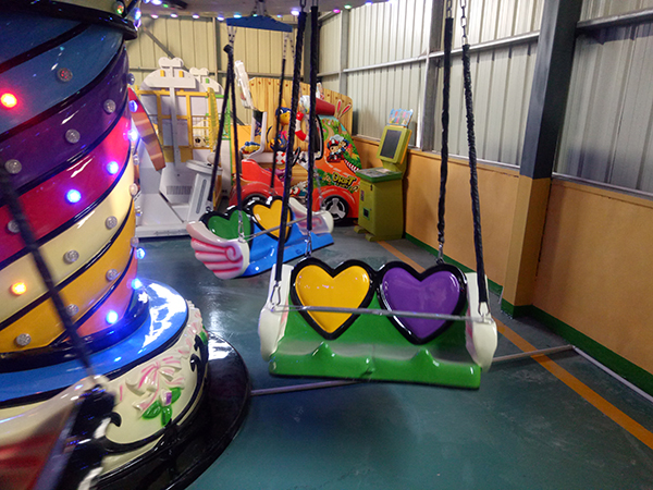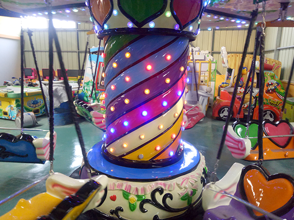 七彩小飛椅是專為兒童量身定做的兒童游樂設備,大型的飛椅都比較適合尋求刺激追求個性的年輕人,但是只能讓小朋友們在旁邊眼巴巴看著卻沒有勇氣去嘗試。一顆顆在躁動的小心靈,所以龍之盈游樂推出了這款安全縮小版的七彩小飛椅,它雖然只有6個座艙,但是每一個座艙都可以容納兩個人,有人陪伴,就有了依靠,會感到安全,會變得勇敢,也是一次非常好的鍛煉機會。